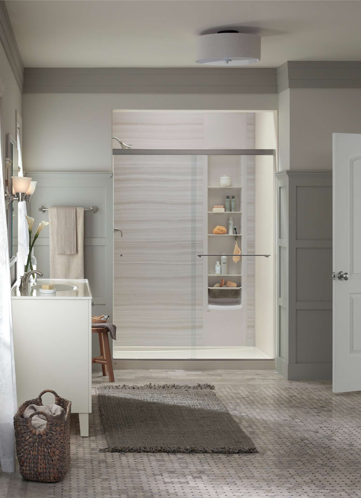 Discover customizable KOHLER® LuxStone® showers crafted from crushed stone and engineered for timeless elegance, strength, and everyday comfort.